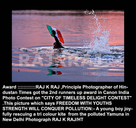 NEW Delhi ::::::::Award ::::::::::::RAJ K RAJ ,principle photographer of hindustan times got the 2nd runners up award in canon india photo contest on "city of timeless delight contest" .this picture which says FREEDOM WITH YOUTHS STRENGTH WILL CONQUER POLLUTION:- A young boy joyfully rescuing a tri colour kite from the polluted Yamuna in New Delhi Photograph RAJ K RAJ/HT 29/July/2008